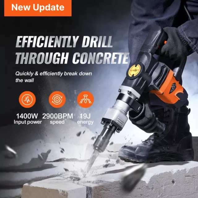 • Powerful 1400W Motor: This jackhammer is equipped with a 1400W industrial-grade motor that delivers 19J of impact energy, making it ideal for heavy-duty work like breaking concrete and metal with ease.