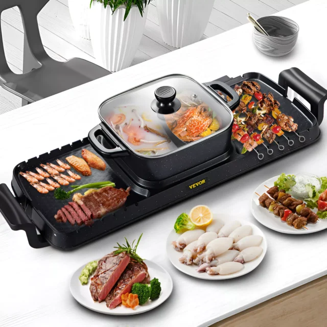Enjoy the ultimate home dining experience with this versatile 2-in-1 electric BBQ grill and hot pot. Designed for up to 8 people, it combines two crowd-pleasing cooking styles in one sleek countertop appliance. Whether it’s a cozy dinner for two or a lively get-together with friends, this powerful 2400W cooker lets you grill and enjoy hot pot simultaneously. With independent temperature controls, a nonstick surface, and a detachable design for easy cleaning, this unit makes entertaining effortless and delicious.
