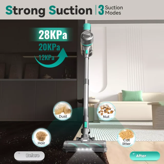 • High Power Suction – With an impressive 28Kpa suction, this vacuum tackles even the toughest dirt and debris on carpets, hard floors, and upholstery.