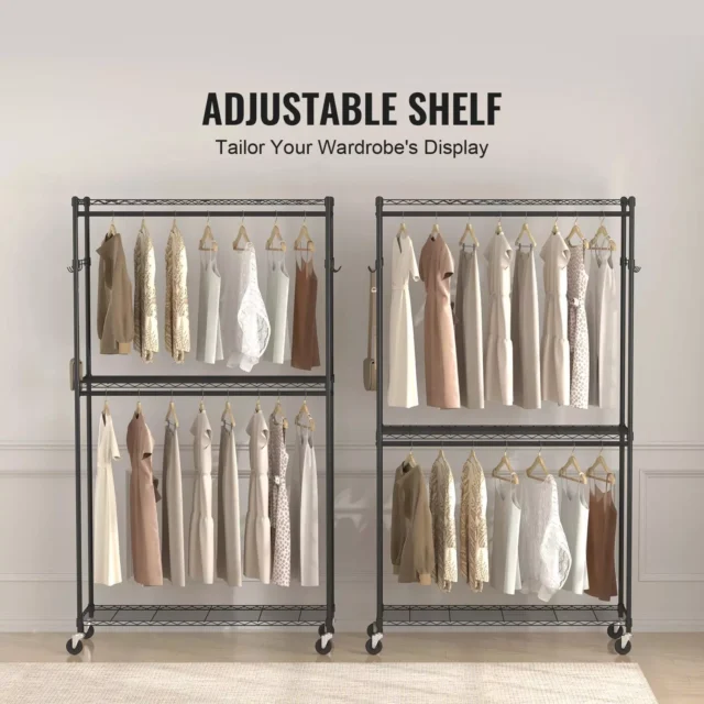 What sets this garment rack apart is its combination of strength, versatility, and practicality. Its ability to adjust the top shelf’s height gives you the flexibility to store different types of clothing, from long dresses to short jackets. The rack is built to withstand heavy loads, making it perfect for storing multiple garments without worrying about sagging or damage. The rolling casters add convenience, letting you easily move the rack to wherever you need it, and then lock it in place for stability. Whether you’re organizing at home or displaying clothing in a boutique, this rack offers everything you need for a clean, organized, and efficient space.