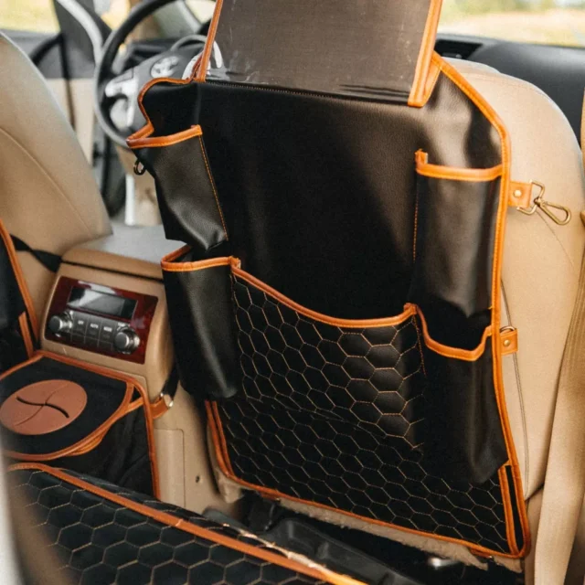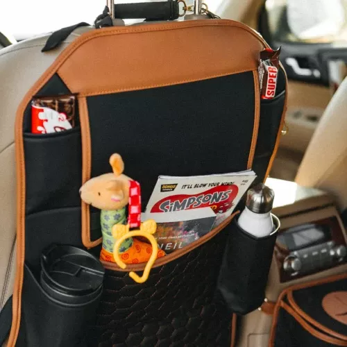 Crafted from smooth eco-leather, this seat organizer is waterproof and easy to clean with a damp cloth. The clear TPU pocket is also waterproof and safe for babies. All the materials used are vegan and non-toxic.