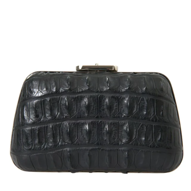 This exquisite clutch is made in Italy using premium materials to ensure unmatched quality and durability. The sleek black crocodile skin exterior is accentuated by silver metal detailing, creating a striking contrast that exudes opulence. Finished with 3% lamb leather for added refinement, this clutch embodies sophistication in every detail.