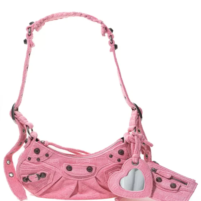 The Balenciaga Le Cagole Pink Shoulder Bag is more than just an accessory—it’s a statement piece. The chenille-effect finish and antique-inspired details give it a vintage charm, while the modern silhouette and thoughtful design make it perfect for today’s fashion-forward woman. Its functional features, including the mini coin purse and adjustable strap, ensure practicality without compromising style. This bag seamlessly transitions from day to night, adding a touch of glamour to any outfit.