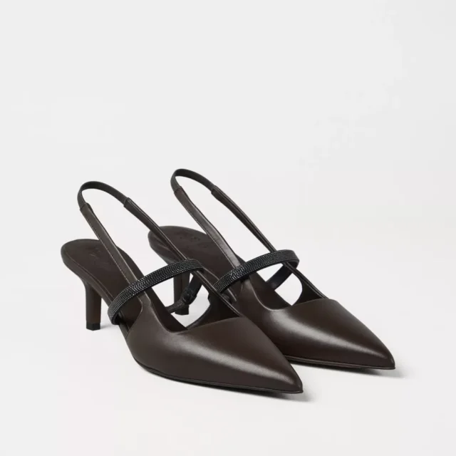 Discover the perfect balance of sophistication and comfort with the Brunello Cucinelli Leather Pumps. Designed to elevate any outfit, these stylish pumps combine timeless elegance with modern flair. Featuring an elongated toe, a leather kitten heel, and an elasticized slingback, these shoes are as functional as they are fashionable. The front band is adorned with iconic appliqué shiny jewels, adding a touch of sparkle that makes these pumps truly unique. Whether you’re heading to the office, a special event, or an evening out, these pumps will ensure you step out in style.
