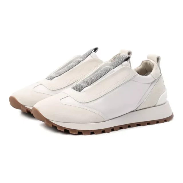 The soft suede details not only enhance the sneakers’ visual appeal but also provide a rich, tactile feel that adds to their luxurious charm. The monogram on the heel serves as a subtle nod to the high-quality craftsmanship of Brunello Cucinelli, making them a must-have for anyone who values understated elegance. Whether you’re going for a polished yet relaxed look or dressing up a casual outfit, these sneakers will complement your style effortlessly.