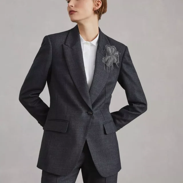 Made from premium virgin wool, this blazer offers exceptional comfort and warmth without compromising on breathability. Its double-breasted front closure with contrasting buttons exudes classic charm, while the spear lapels and structured shoulders create a sleek and polished silhouette. The iconic Precious Flower Crest applique on the front adds a unique touch of luxury, cementing its place as a standout piece in any collection.