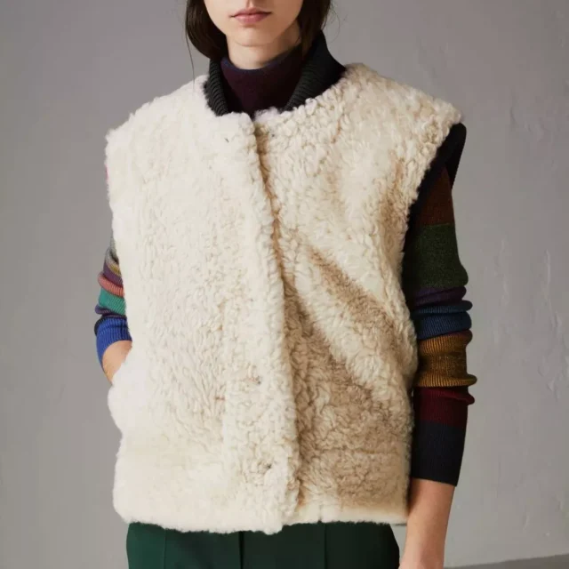 Introducing the stunning BURBERRY Warrenford White Shearling Vest Jacket, a luxurious and stylish addition to your wardrobe. Crafted with 100% authentic sheep shearling, this vest jacket offers unmatched warmth, comfort, and a sophisticated look. The white color brings a fresh, clean aesthetic, while the impeccable design adds a timeless touch to any outfit. Whether you’re heading to a chilly outdoor event or want to make a statement on a crisp evening, this vest is your perfect companion.