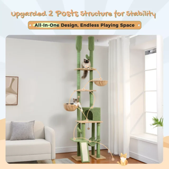 Whether you have one playful kitten or several curious cats, this floor-to-ceiling cactus cat tower is designed to cater to their every need. With ample space and durable features, it’s the ideal addition to any home that wants to enrich their cats’ lives with plenty of exercise, comfort, and fun.