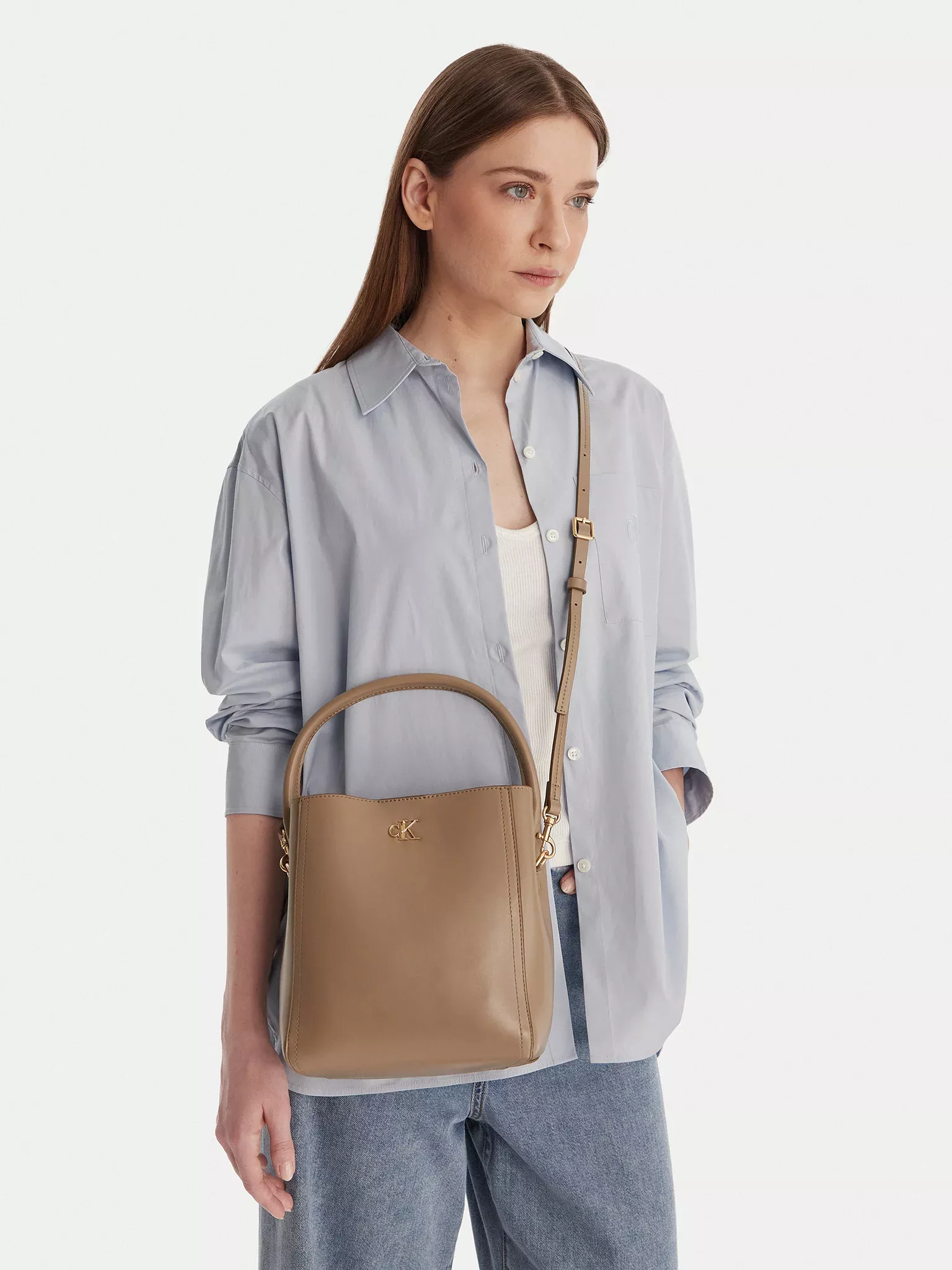 The Calvin Klein Monogram Hardware Bucket Bag is designed for women who love clean lines and modern elegance. With its soft beige tone and iconic monogram hardware, this bag brings understated luxury to your spring wardrobe. Its bucket shape offers a relaxed yet polished look, making it easy to pair with casual outfits or more refined styles. This is the kind of bag you reach for when you want to feel confident, stylish, and put together without trying too hard.