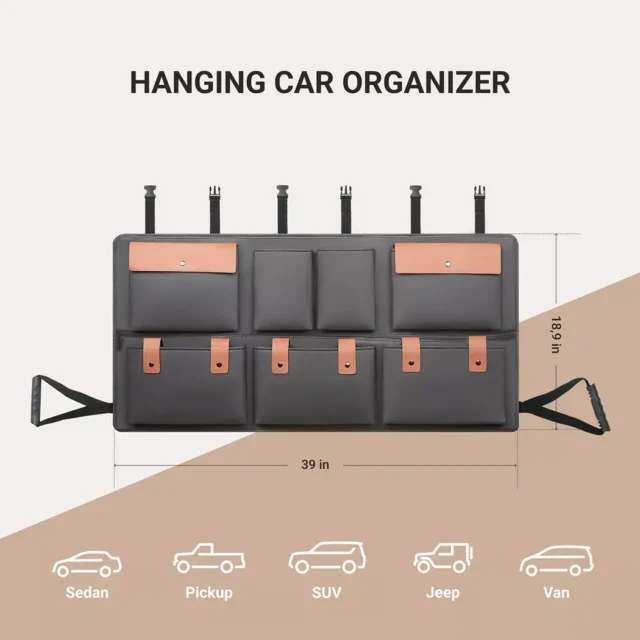 This product certainly lives up to its name as an excellent car trunk organizer! It features strong PVC buckles along with solid textile headrest straps ensuring everything stays intact even during long drives or bumpy terrains. Moreover, being made out of waterproof eco-leather makes cleaning super convenient – just wipe off dirt or liquids using a damp cloth!
