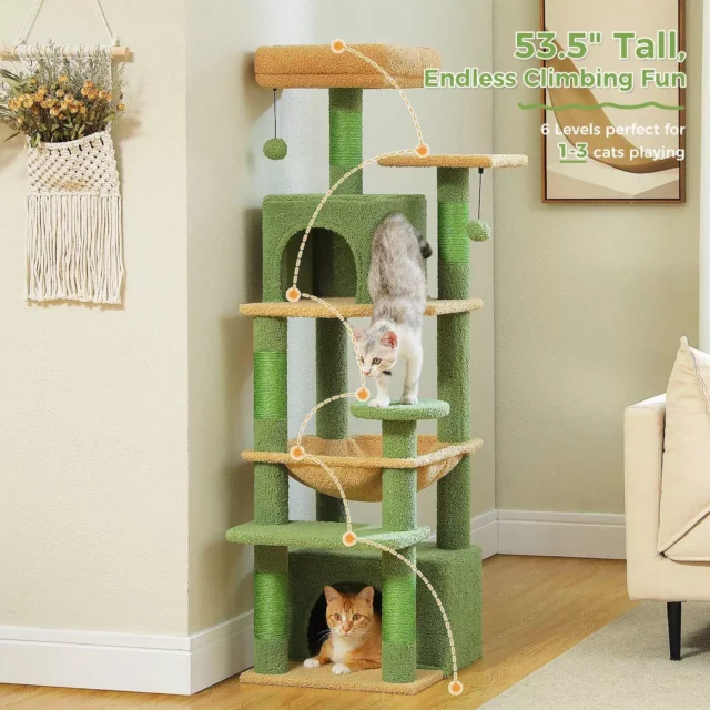 Give your cat the ultimate indoor playground with this spacious 53-inch cat tree tower. Designed to meet all of your kitty’s needs, from scratching to climbing, sleeping, and lounging, this green cat tree is a must-have for any indoor cat. With its multi-level design and sturdy build, it provides endless fun and comfort for your furry companion while helping to protect your furniture.