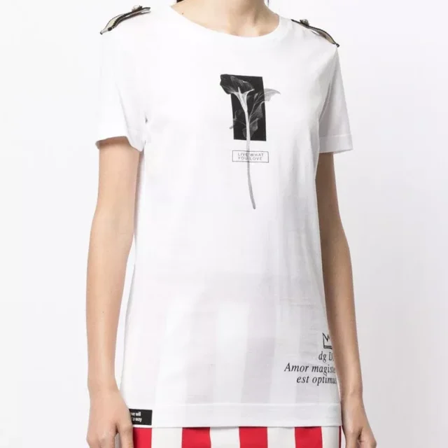 Get ready to experience the sophistication and luxury of Dolce & Gabbana with this exclusive T-shirt. Perfect for any fashion-forward individual who seeks style, comfort, and elegance all in one, this piece is sure to be a cherished addition to your wardrobe. Don’t miss out on owning this stunning T-shirt — it’s time to add a touch of “Amore” to your collection.