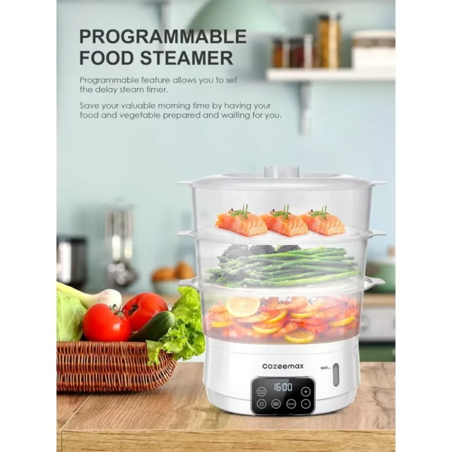 Whether you’re meal prepping for the week, cooking a healthy family dinner, or just looking for a hassle-free way to prepare meals, this digital steamer makes it easy. Its programmable timer lets you plan ahead, and the auto shut-off with boil-dry protection ensures safe and worry-free cooking.
