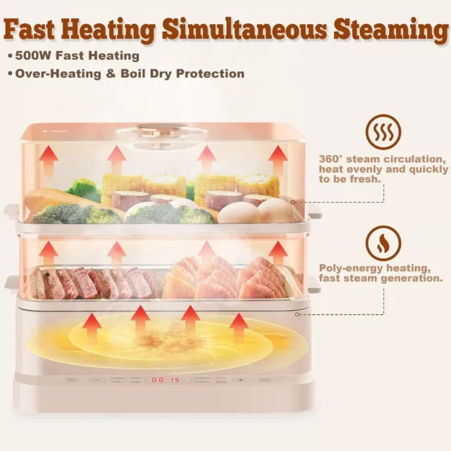 The 500W heating element powers up in just 8 seconds, delivering instant steam to cook your food evenly while locking in nutrients and flavor. Its compact footprint and nestable design make it ideal for small kitchens, apartments, or anyone who loves smart storage solutions. Plus, the anti-scalding handle and heat-dissipating base keep things safe and cool to the touch.