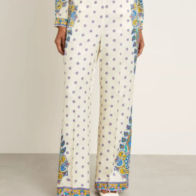 Elevate your wardrobe with the luxurious Etro Silk Paisley Print High-Waisted Pants. Designed for those who crave sophistication with a bold touch, these pants feature an all-over paisley pattern that reimagines the classic motif with vibrant movement and color. Crafted from premium-quality silk, this stunning piece offers an elegant yet lightweight feel, making it a perfect choice for both refined daytime outings and chic evening events.