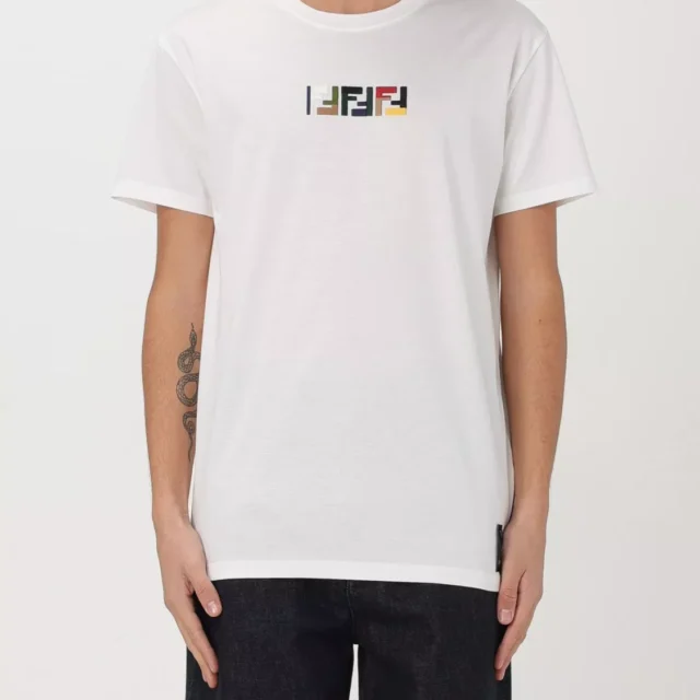 This Fendi T-shirt is not just about looks; it’s about making a statement. The contrasting multicolored logo elevates this shirt from a basic tee to a sophisticated piece of luxury. Whether you’re dressing up for a casual outing or pairing it with your favorite jacket for a more polished look, this tee adapts to your personal style. The monochrome design ensures that it pairs effortlessly with a wide range of outfits, from jeans to tailored trousers, making it a versatile wardrobe essential.