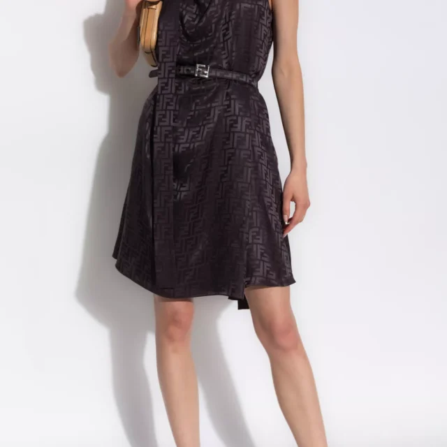 Step into sophistication with the Fendi Silk Midi Dress, a statement piece that blends luxury with modern design. Crafted from high-quality silk, this sleeveless dress offers a sleek and flattering silhouette, perfect for a variety of occasions. The soft neckline, adorned with a delicate ribbon detail, adds a feminine touch to its minimalist style. With the iconic all-over brand monogram, this dress is a true symbol of Fendi’s timeless appeal, while subtle features like the side slit pockets and matching belt with a logo buckle make it practical yet luxurious.