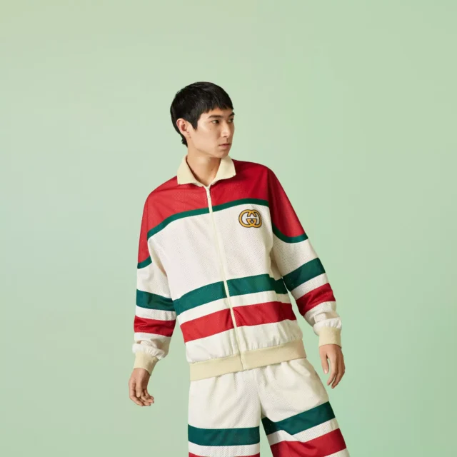 This jacket is an ideal choice for those who appreciate iconic design with a contemporary twist. The combination of the off-white and red cotton mesh fabric with the subtle Gucci GG logo creates a striking yet versatile piece that can easily be paired with jeans, joggers, or even shorts for a laid-back yet polished look.