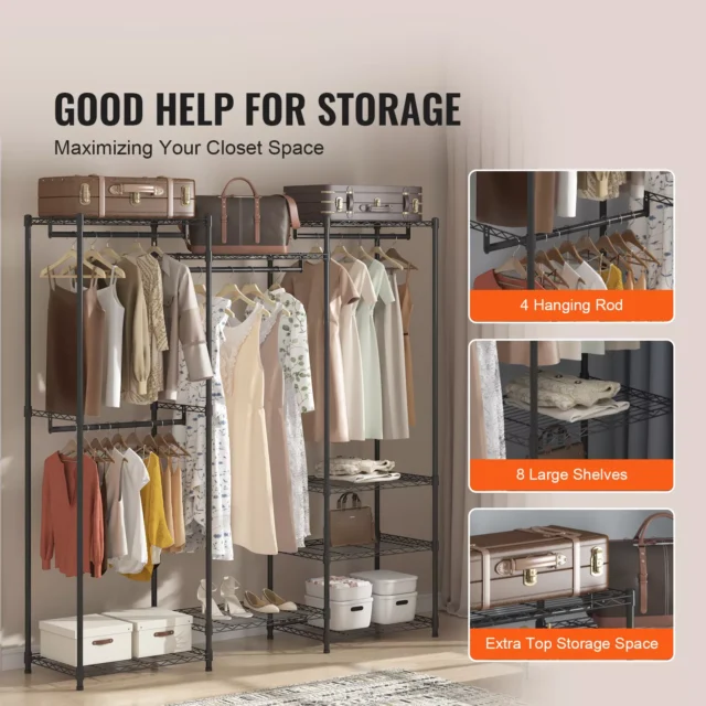 The rack’s large dimensions (68.5”x17.7”x70.9”) offer ample storage space for all your clothing items, from everyday garments to seasonal outfits. Featuring multiple adjustable shelves and hanging rods, it provides perfect organization for everything from shoes and accessories to bulky coats and dresses.