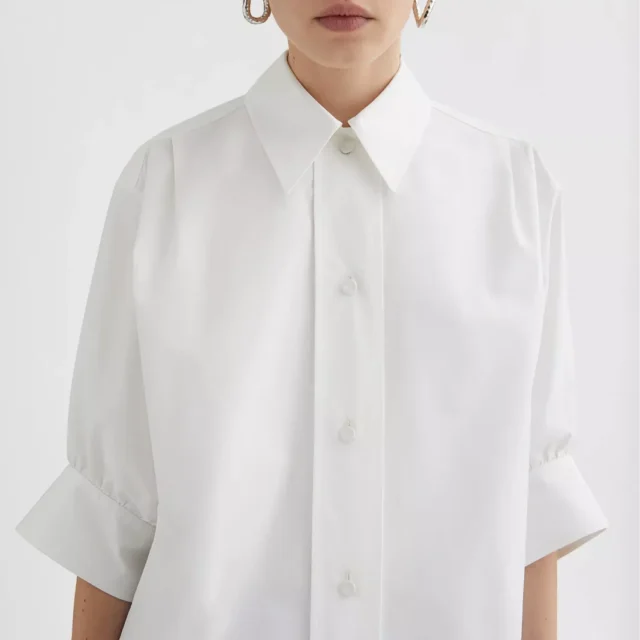 Crafted from high-quality cotton, this shirt offers a lightweight and breathable feel, making it ideal for warm days or layered looks. The classic collar adds a refined touch, while the short balloon sleeves provide a contemporary twist on a timeless silhouette. A front button closure ensures ease of wear and a polished finish, making this shirt as practical as it is stylish.