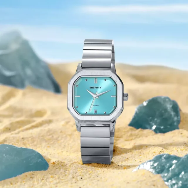 Built for daily wear, this watch features a solid stainless steel case and strap with a refined butterfly clasp, ensuring both security and elegance on the wrist. The mineral glass lens with sapphire coating offers excellent scratch resistance, while the ergonomic case curvature fits comfortably for long hours of wear. At just 0.3 inches thick, it combines durability with sleekness, making it as practical as it is stylish.