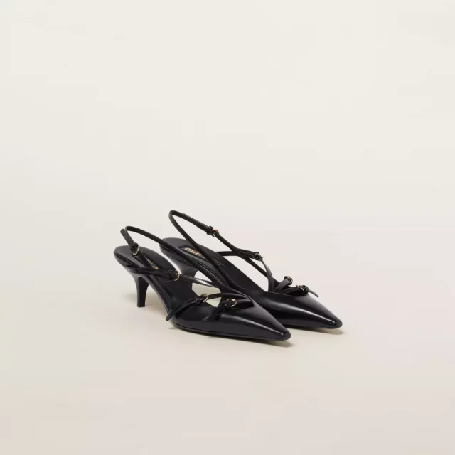 Discover the perfect combination of sophistication and comfort with Miu Miu’s Calfskin Leather Pumps. Designed to bring elegance to any outfit, these pumps feature a sleek leather upper, complemented by a delicate kitten heel for a feminine, flattering look. The adjustable leather applique straps at the back of the foot and the adjustable slingback at the heel ensure a customized fit, giving you both style and comfort in one stunning shoe. With a contrasting logo insole, these pumps exude high-end luxury while providing all-day wearability.