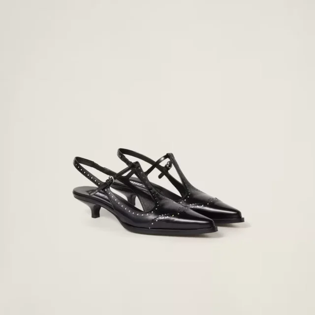 What sets the Miu Miu Patent Leather Pumps apart is their seamless fusion of elegance, comfort, and modern design. The combination of the shiny patent leather, the sophisticated elongated toe, and the comfortable kitten heel makes these pumps suitable for both work and play. The elasticized slingback and adjustable buckle fastening provide a customized fit, ensuring that your feet stay comfortable and secure all day long. The contrasting logo insole is a luxurious detail that adds to the overall premium feel of the shoes.