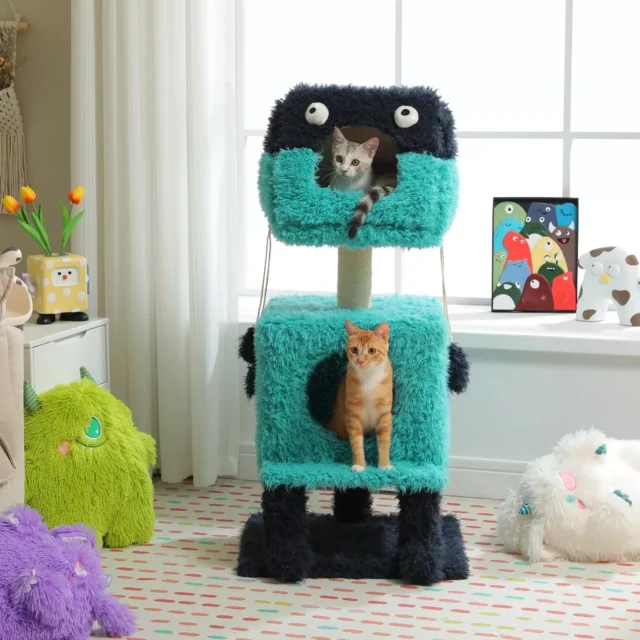 Small cats and kittens will absolutely love the two-level structure of this cat tree. It’s ideal for younger cats that are still discovering their surroundings. The monster-themed design provides a whimsical element, making it a great focal point in any room, and will have your cat entertained for hours. Whether they’re scratching, napping, or just playing with the quirky toys, your cat will enjoy every second spent in this fun, comfy space.