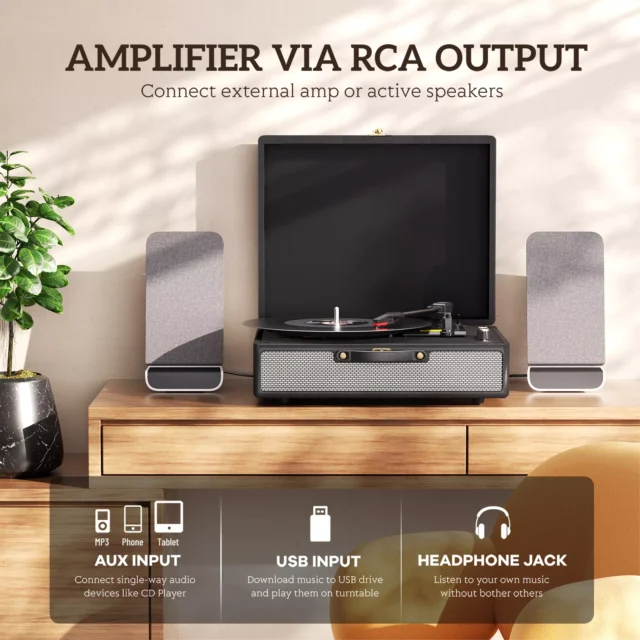 • Multiple Audio Inputs: In addition to Bluetooth, connect via AUX or RCA for versatile listening options. The built-in stereo speakers offer high-quality sound, and you can easily amplify the music with external speakers if needed.