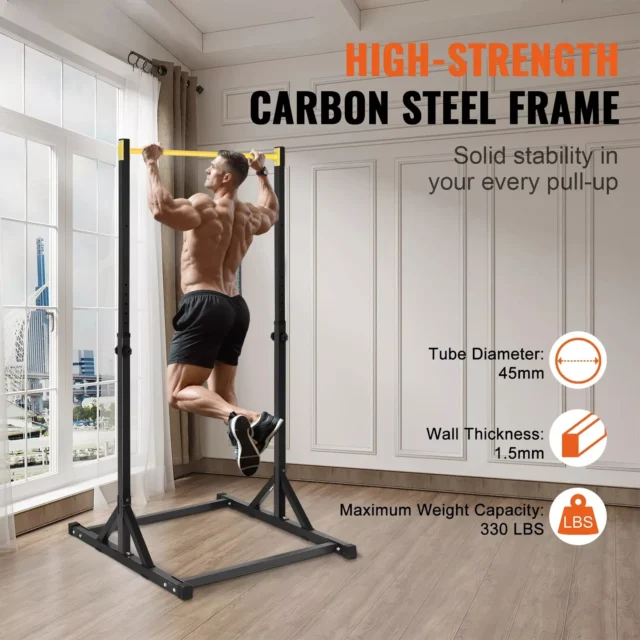 Crafted from rust-resistant carbon steel with a high-load capacity of up to 330 lbs, this power tower is built to last. Its reinforced 1.5mm thickened steel pipes, H-shaped stable base, and non-slip feet provide exceptional stability, ensuring a safe and secure workout. The integrated triangular support structure minimizes wobbling, so you can focus on your training with confidence.