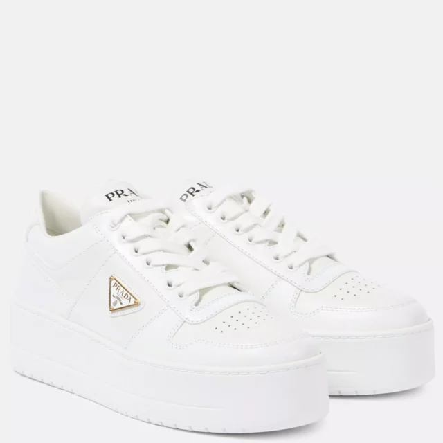 What sets these sneakers apart is the iconic triangular enameled logo on the side panel—a subtle yet unmistakable nod to premium craftsmanship. The calfskin leather offers a refined texture, ensuring durability and a sophisticated look. From the contrasting heel detail to the non-slip sole, every feature of these sneakers is designed to cater to both style and comfort enthusiasts.