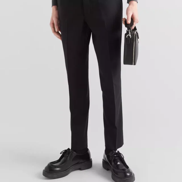 These Prada black wool pants are ideal for any occasion where sophistication is key. Pair them with a tailored blazer for business meetings or formal events, or dress them down with a crisp shirt for an elevated casual look. Their versatile design makes them suitable for office settings, evening gatherings, or stylish weekend outings.
