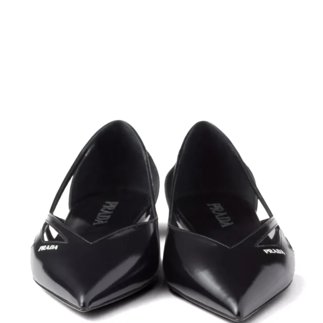 The combination of fine leather, unique cut-out accents, and Prada’s signature branding sets these ballerinas apart. They’re not just shoes—they’re a statement of timeless elegance and modern sophistication. The elongated toe and contrasting details make them an essential addition to any wardrobe, blending effortlessly with your personal style.