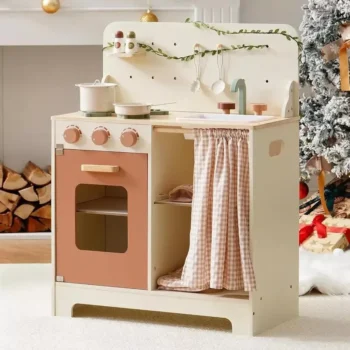 Rustic Kids Wooden Play Kitchen Set with Light String, Apron, and Gloves – Pretend Play Kitchen for 3+