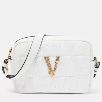 Versace White Nappa Leather Crossbody Bag with Logo and Zipper Closure