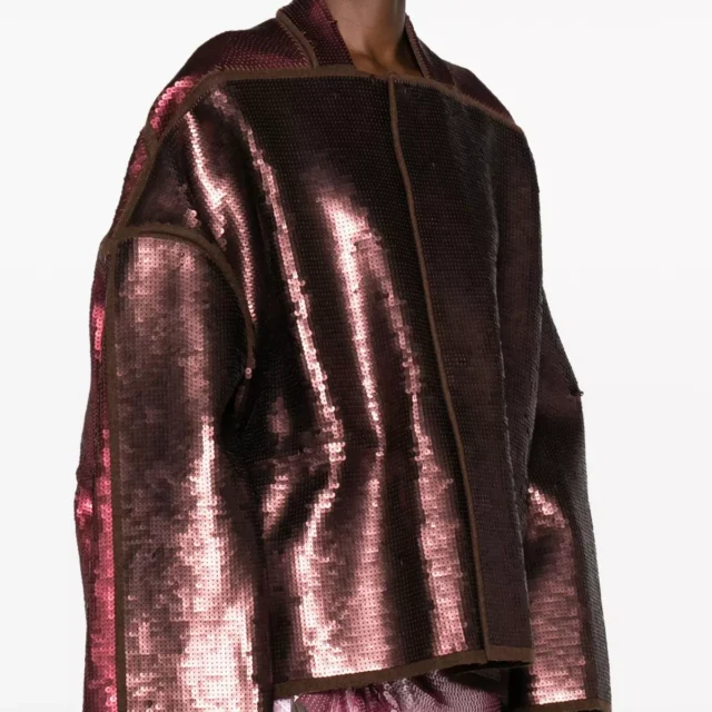 What makes the Rick Owens Wool Sail Jacket truly special is its ability to combine bold style with practicality. The intricate sequin appliqué gives it a glamorous touch, while the geometric neckline and wide sleeves keep the overall look fresh and innovative. Whether you’re layering it over a casual outfit or pairing it with evening wear, this jacket is sure to turn heads.