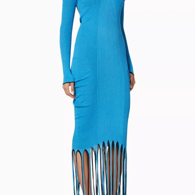 The Saint Laurent Women’s Blue Silk-Blend Dress with Ribbed Fringes is a masterpiece of contemporary fashion. Designed to exude confidence and boldness, this dress seamlessly blends luxury with edge. Made from a double-layered, silk-blend knit, it hugs your figure beautifully while ensuring unparalleled comfort. Whether you’re stepping out for a glamorous evening or making a statement at a high-profile event, this dress guarantees all eyes will be on you.