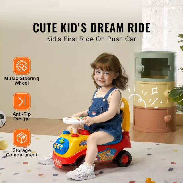 Give your child the gift of fun and mobility with this adorable Toddler Ride On Push Car. Designed for kids aged 1-3, this sit-to-stand push car helps them develop balance, coordination, and confidence as they explore the world around them. With a sturdy four-wheel design, a music-playing steering wheel, and a hidden seat storage compartment, this ride-on car is packed with features to keep your little one entertained and safe.