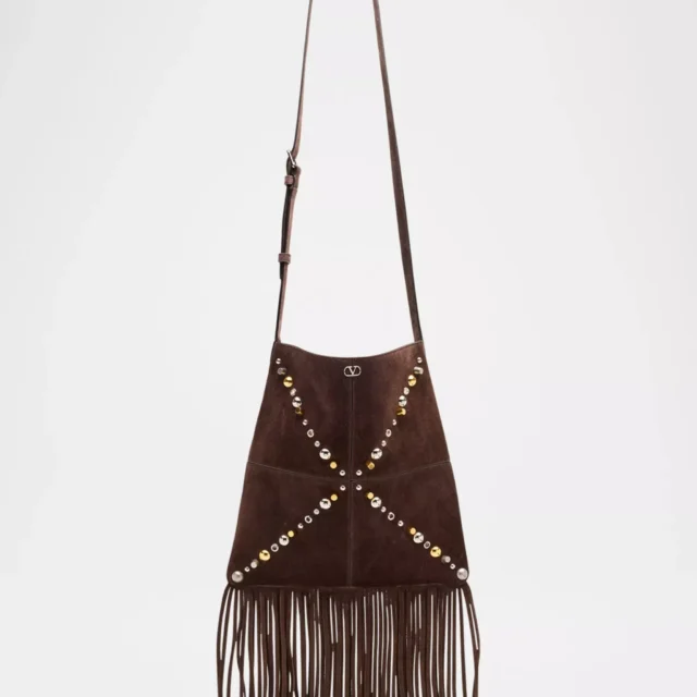 The adjustable shoulder strap offers comfort and flexibility, while the zippered top closure ensures that your belongings are secure. This bag’s front and back are adorned with applied round studs, adding a fierce edge to the sleek suede finish. The iconic Valentino Garavani logo plaque on the front serves as a subtle yet luxurious branding detail, setting it apart from other bags. Fringing on the bottom of the bag adds dynamic movement and a playful accent, elevating the overall look to new heights of fashion.