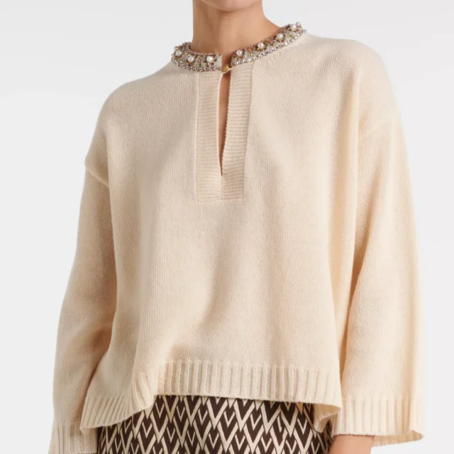 Add a touch of refined elegance to your collection with the Valentino Jewel Neck Sweater. Whether you’re attending a special event or elevating your everyday look, this piece offers unmatched sophistication and style. Shop now and let the Valentino Jewel Neck Sweater redefine your wardrobe with its luxurious charm.