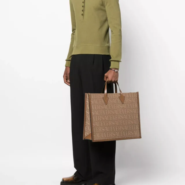 This Versace crossbody tote bag is the ultimate combination of form and function. Its spacious interior allows you to carry everything you need, from your laptop and documents to daily essentials, making it perfect for work, shopping, or weekend getaways. The brown color and luxurious logo hardware ensure it pairs effortlessly with any outfit, adding a touch of elegance to your look.