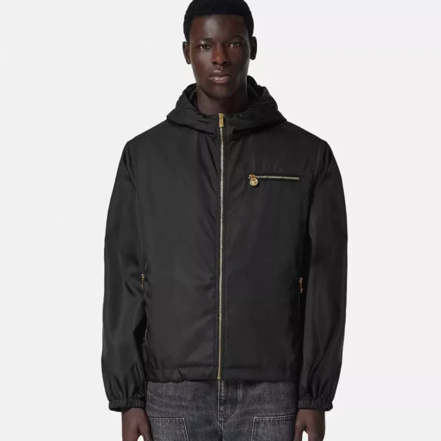 The Versace Hooded Jacket features a zippered front closure for easy wear, two zippered side welt pockets, and a zippered front breast pocket adorned with the legendary Medusa logo – a symbol of Versace’s signature style. The adjustable hem with a concealed drawstring ensures a snug fit, while the elasticized cuffs add extra warmth and protection from the elements.