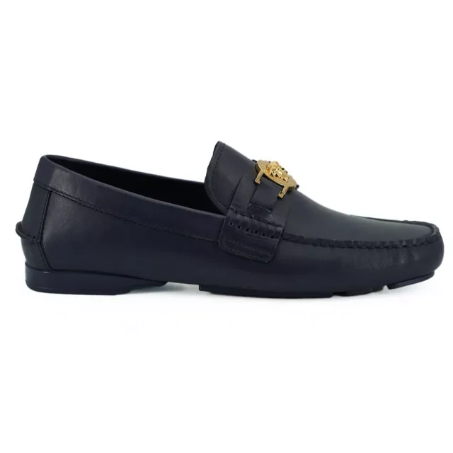The Versace Navy Blue Calf Leather Loafers are more than just shoes—they are a statement of refinement and taste. The exquisite craftsmanship ensures these loafers are not only stylish but also built to last. The luxurious calf leather and iconic Medusa hardware make them a must-have for anyone who values timeless fashion. Perfect for formal occasions, important meetings, or elegant evenings, these loafers are as versatile as they are striking.
