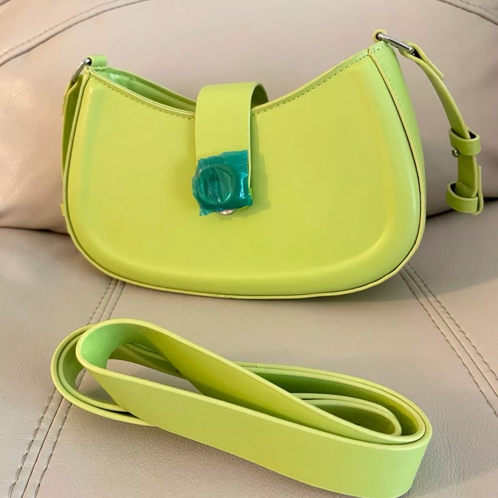 The bag arrived exactly as depicted in the photos, in green, and without any marks or stains. It's perfect as a shoulder bag.