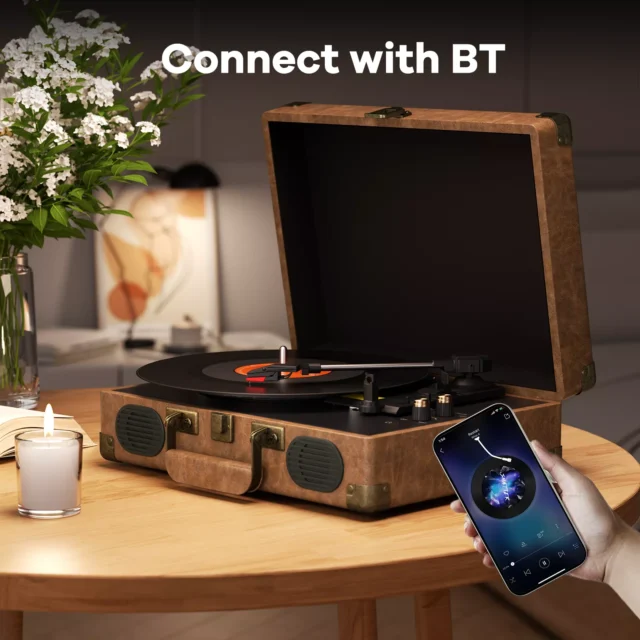 Whether you’re streaming music wirelessly or connecting external devices, this turntable has you covered. The built-in Bluetooth speakers allow you to stream digital audio directly from your Bluetooth-enabled devices, bringing your favorite tunes to life without any hassle. For those who prefer traditional connections, you can hook up external speakers via the RCA output or use the Aux-in line for non-Bluetooth devices like MP3 players. Plus, if you want to enjoy some private listening, the headphone jack lets you do just that.